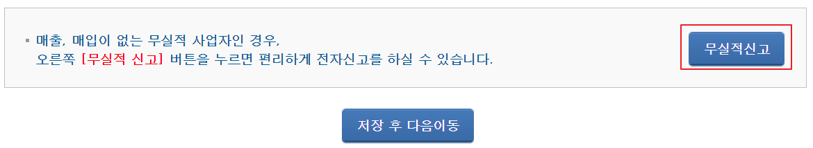 5. 지난해 매출이 하나도 일어나지 않았다면 무실적신고를 선택하면 됩니다. 만약, 5천원이라도 사업 덕분에 수입이 생겼다면 저장후 다음으로 이동해서 매출 및 매입자료를 입력합니다. 숫자를 넣으면 자동으로 내야할 세액이 계산되어 나옵니다. 얼마인지 보고 국세처리 은행으로 가서 납부하면 됩니다.