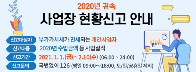 2020년 귀속 사업장 현황신고 안내도 한창입니다. 부가가치세가 면세되는 개인사업자는 작년도 수입금액 등 사업실적을 정리해서 2021년 1월 1일(금) ~ 2월 10일 수요일 자정까지 이행하시길 바랍니다.