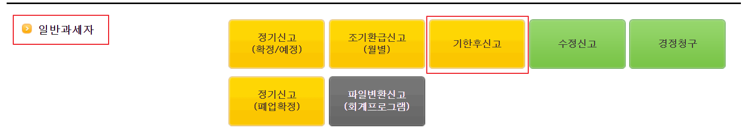 3. 일반과세자 > 기한후 신고로 들어갑니다. 간이과세자도 큰 차이 없습니다. 본인의 항목에서 같은 라인에 있는 동일단어의 메뉴를 선택하면 됩니다.