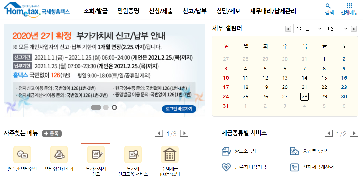 국세청 홈택스 홈페이지에서는 부가가치세를 신고하고 납부할 기간이 지연됐어도 처리할 수 있는 시스템을 마련해두고 있습니다.