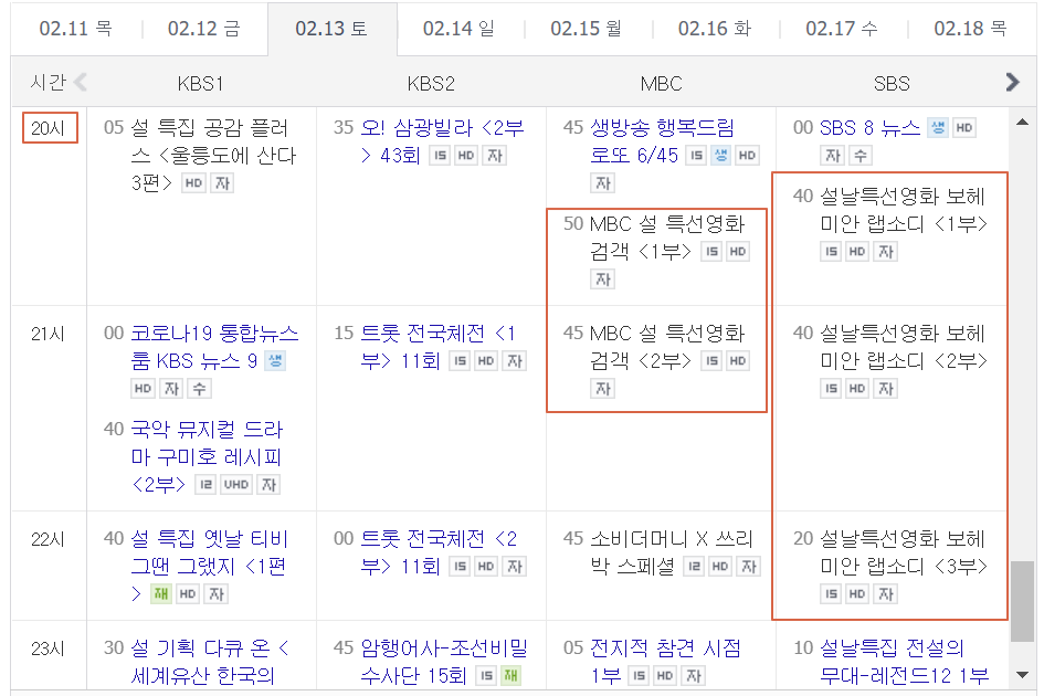 설 TV 공중파 특선영화 편성표