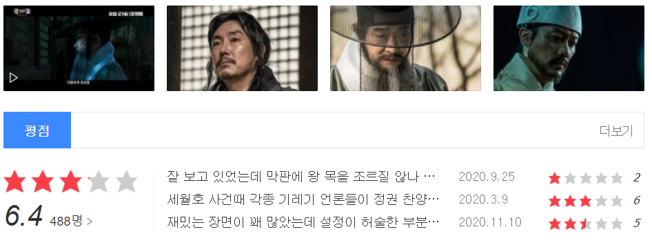 원래는 장혁 주연의 검객도 다뤄야하지만 아무래도 체급차가 많이 나는것 같아서 패스합니다. 그럼에도 불구하고 평가는 상당히 좋은편이니 보헤미안을 이미 봤던 분들이라면 MBC 오후 8시 50분에 송출하는 검객을 선택하는것도 괜찮을 것 같습니다.