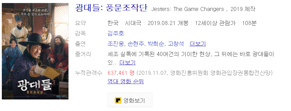 KBS2 TV 오후 8시~9시 30분에 방영하는 광대들 : 풍문조작단은 조선 시대극으로 2019년 개봉한 작품입니다. 108분으로 김주호 감독님이 연출하셨네요. 출연진은 이름있는 분들이 대거 포진합니다. 덕분에 이들을 스크린에서 보는것만으로도 만족스럽죠.