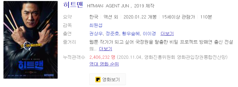 한국판 존웍이라고 부를 정도로 액션미와 연출이 장난아니라고 합니다. 저는 직접 보질않아서 어떤 말을 해야할지 모르겠습니다. 설 TV 공중파 특선영화 편성표 정리는 이것으로 마치겠습니다. 즐건 시간 보내세요.