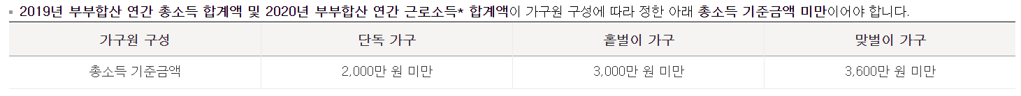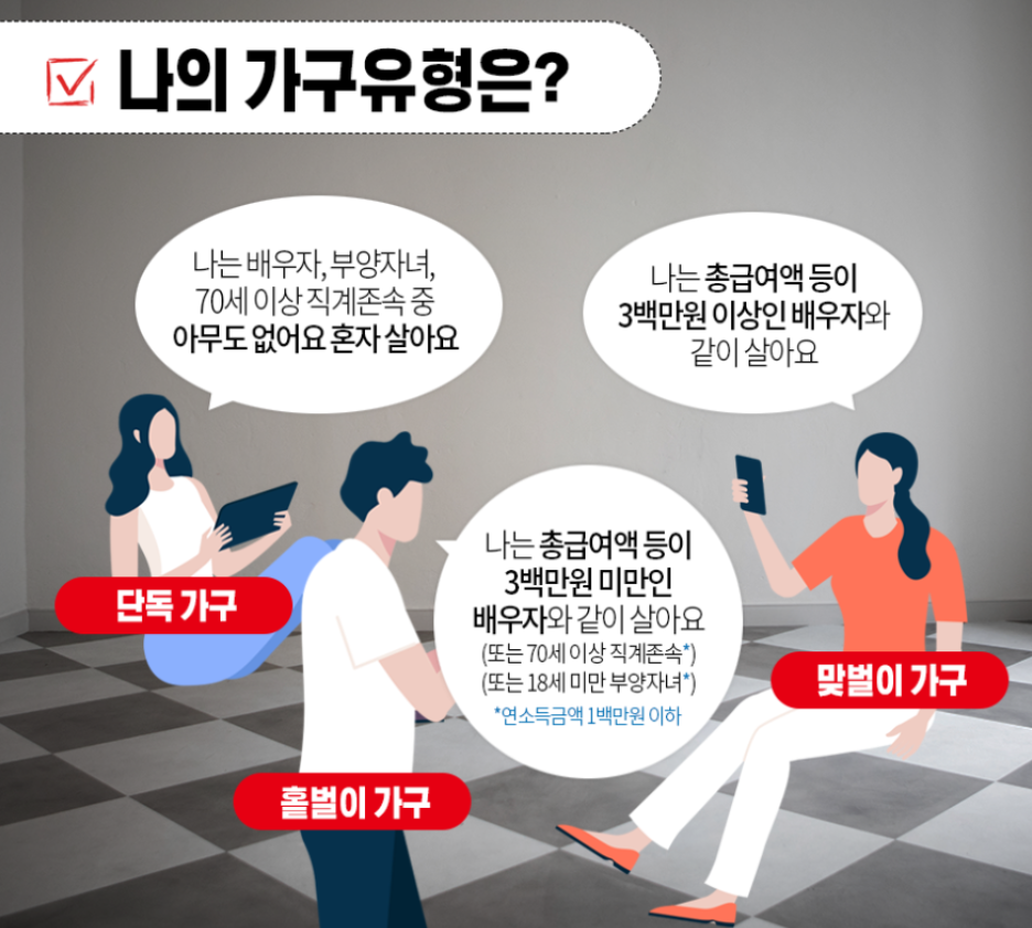 나의 가구유형이 어떻게 되는지부터 짚어봐야 합니다. 단독인지 맞벌이인지 아니면 혼자 벌어서 식구들을 먹여살려야하는 입장인지를 말이죠. 참고로 소득이 남들보다 일반적으로 적은 분들을 돕는다는 취지로 마련된 나라 정책자금인만큼 전문직이라든지 고소득이나 재산이 많은분들은 지원자격이 없습니다.