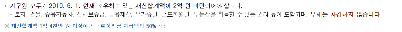 2. 다음은 이분이 재산이 2억원 미만인지를 봐야합니다. 여기서 말하는 재산에는 집만 따지는게 아닙니다. 자동차 같은것도 봅니다. 이분이 지방에 빌라를 하나 사놓은게 있는데, 이게 1억원이고 자동차가 2천만원 수준이면 2억원 미만이란 재산조건 기준에 부합하므로 지급대상자가 됩니다.