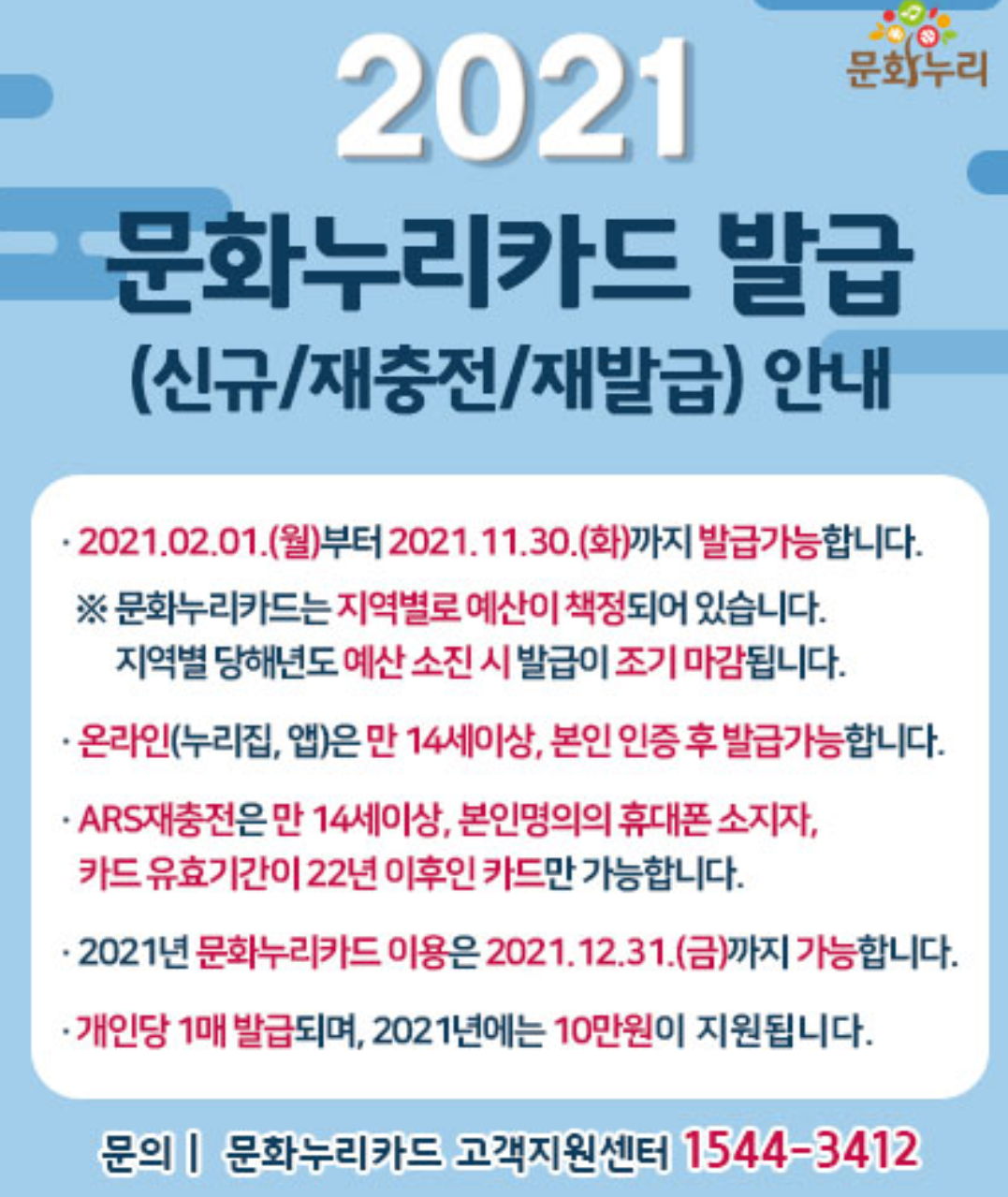 매년마다 사용한도 금액을 1만원 정도 올리고 있습니다. 이건 평균적인 액수라서 정확하다고 말은 못하겠네요. 문화누리카드의 사용기한은 2021년 2월 1일부터 11월 30일까지 입니다. 각 지자체마다 예산이 한정되어 있어서 되도록이면 보는 즉시 신청하시길 바랍니다.
