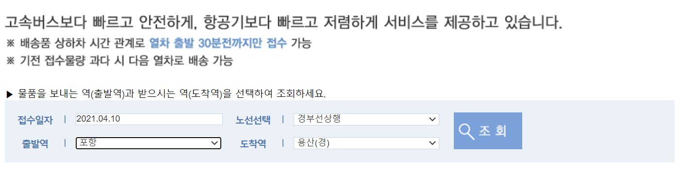 보낼 물건에 대한 상하차 시간이 있는 관계로 열차가 출발하기 30분 전까지만 접수를 할 수 있습니다. 기전 접수물량이 많을 경우에는 다음 열차로 배송할 수 있습니다. 되도록이면 접수일자에 맞춰 어떤 노선으로 운행 가능한지 미리 조회해 가능여부를 체크하시길 바랍니다.