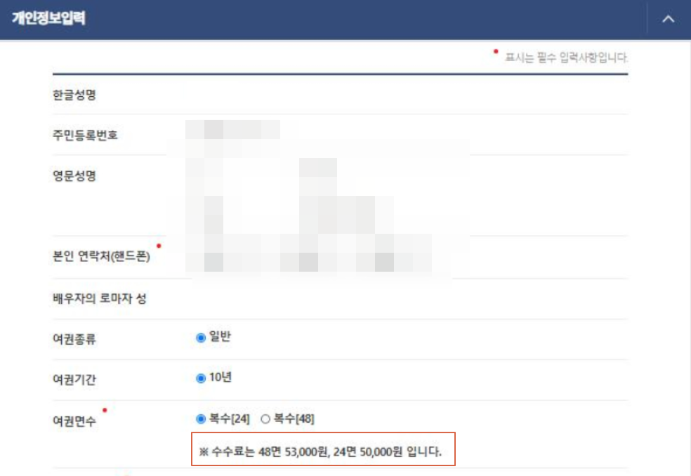 4. 여권종류는 일반으로 기간은 10년으로 복수 24 또는 48면을 선택합니다. 참고로 48면으로 하는게 여권발급 수수료면에서 3천원 차이에 더 많은 장수를 쓸 수 있으니 이걸로 하는게 이득입니다. 사람마다 선택이 다를 수 있지만 말이죠.