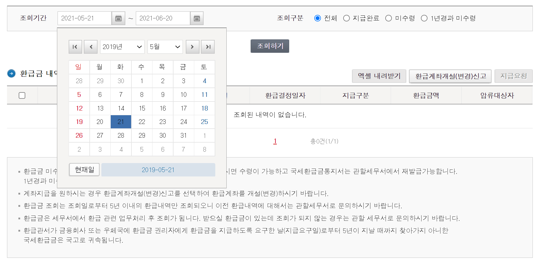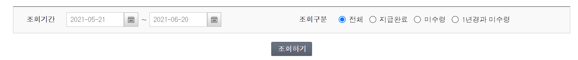4. 조회기간이 보입니다. 현재 시점으로 시간을 설정하면 나오는게 없습니다. 이럴때는 과거에 나온 데이터를 토대로 올해는 언제쯤 받을 수 있는지 예측하는게 최선입니다.