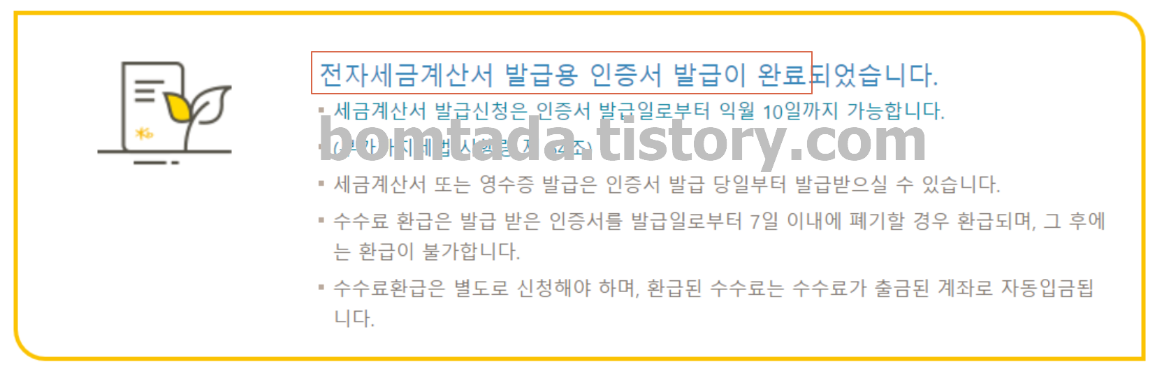 9. 전자세금융 인증서 발급비는 4,400원이 나오게 됩니다. 이건 방금전 입력한 사업자계좌에서 자동으로 빠져나갑니다. 따로 어디로 넣어야하는 등의 과정은 거치지 않습니다.