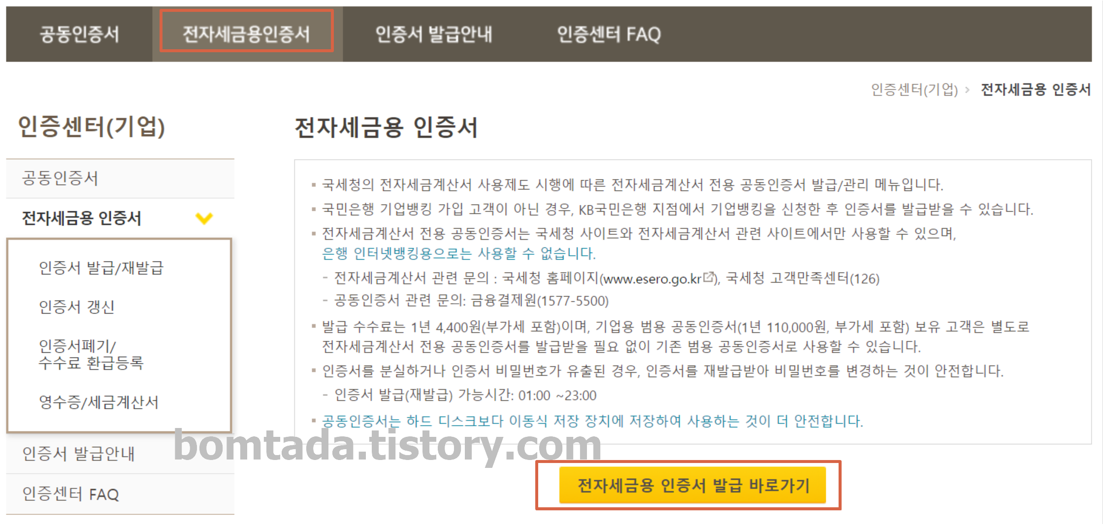 저는 제가 사업자통장을 만들었던 국민은행의 범용 공동인증서 발급방법 위주로 설명드립니다. 타은행도 사용하는 단어는 거의 비슷하므로 이것만 봐도 다 응용해서 할 수 있으니 참고하세요. 지금 알려드리는 방식에 10초만 시간을 할애하면 일반과세자와 간이과제사 세금계산서 발행이 쉬워집니다.