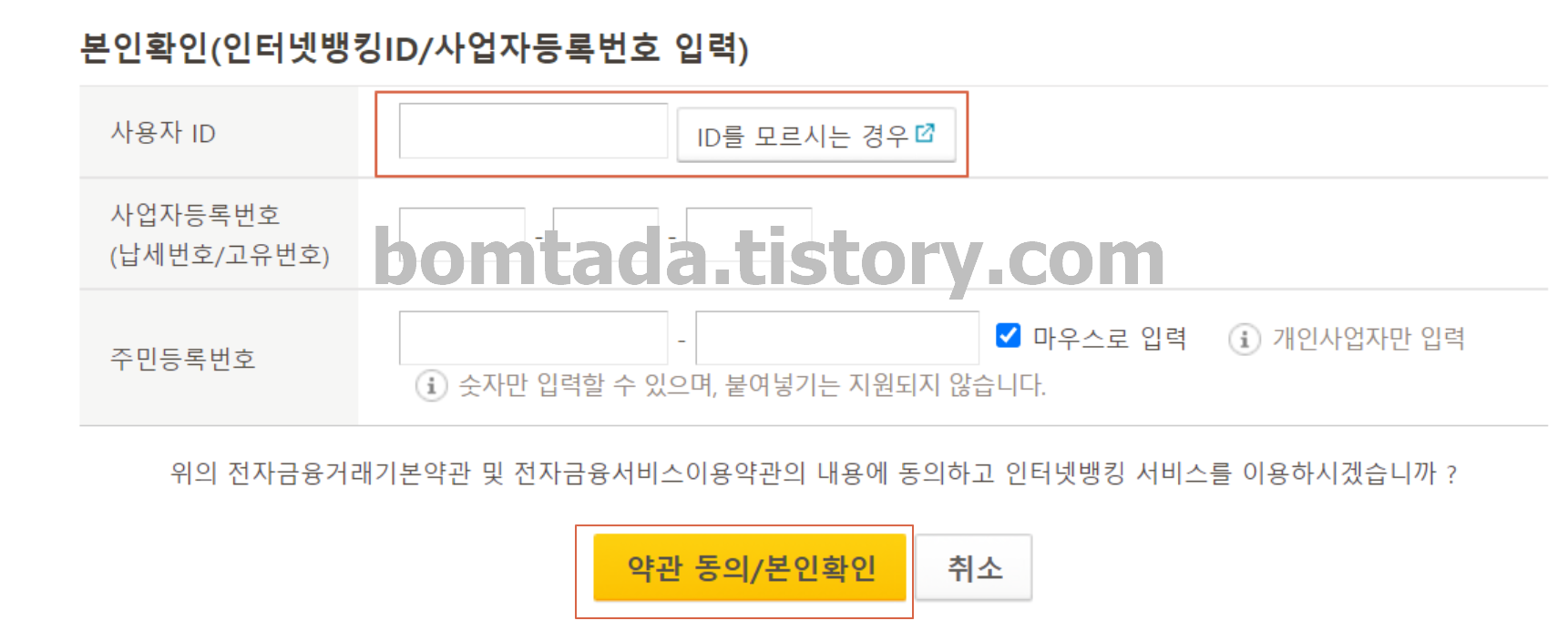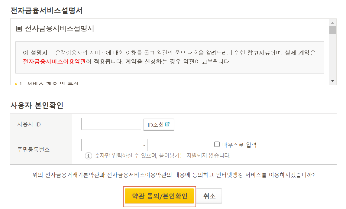 3. 전자금융서비스 설명서를 간략히 읽고 내려가면 사용자 본인확인이 있습니다. 오프라인 영업점에서 만들었던 사용자ID를 이용해 약관 동의 및 본인확인을 거치게 됩니다.