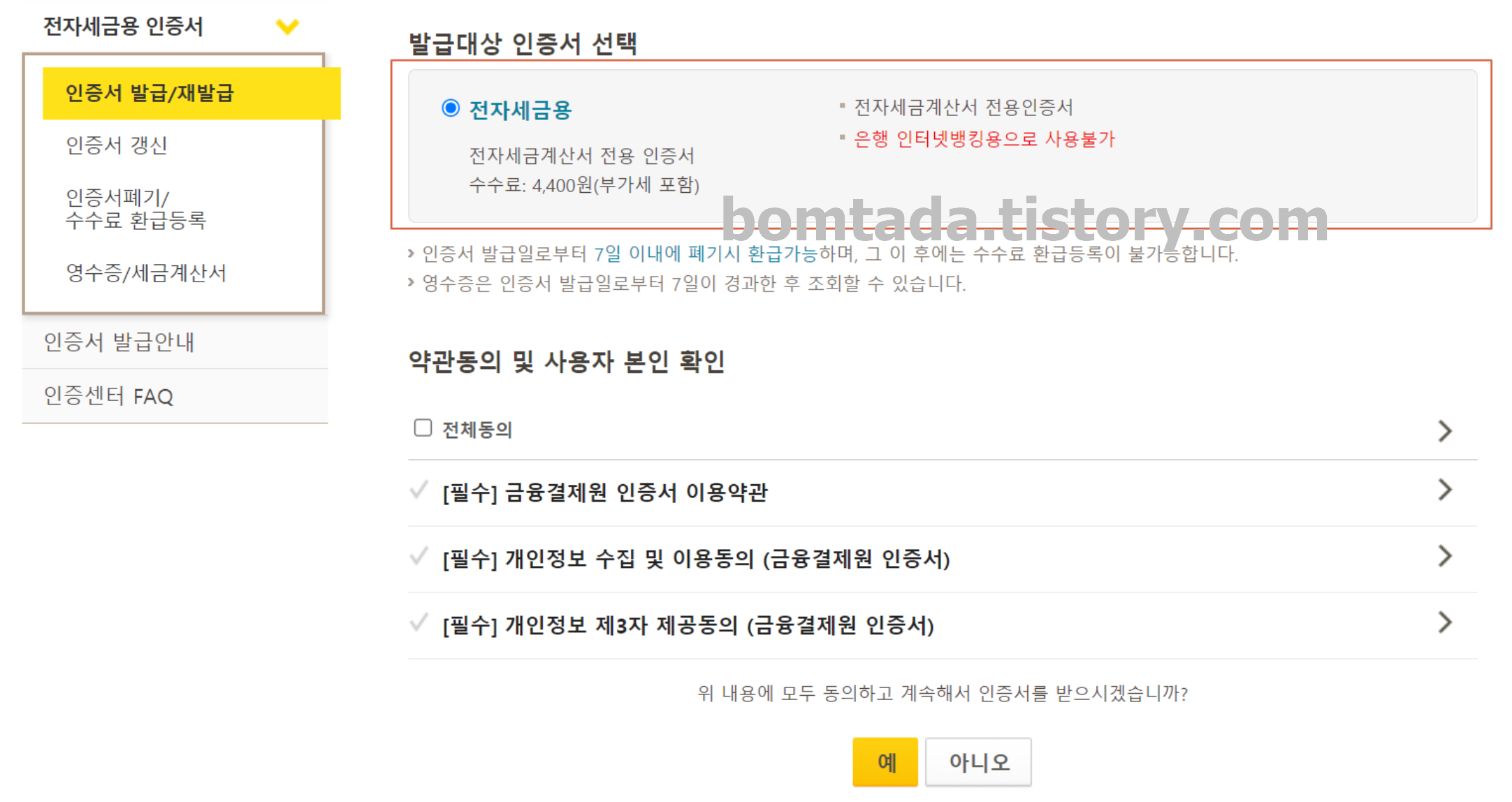 5. 몇번 시도하다보면 '전세금융인증서' 항목으로 넘어가게 됩니다. 1년에 4,400원(부가세 포함)이 발생합니다. 기존에 은행에서 개인적으로 이용하던건 따로 뭐가 발생하지 않았지만 전자세금계산서 발급용은 4천 4백냥을 내야합니다. 이건 통장에서 자동으로 빼가니 계좌만 유지하고 있으면 됩니다.