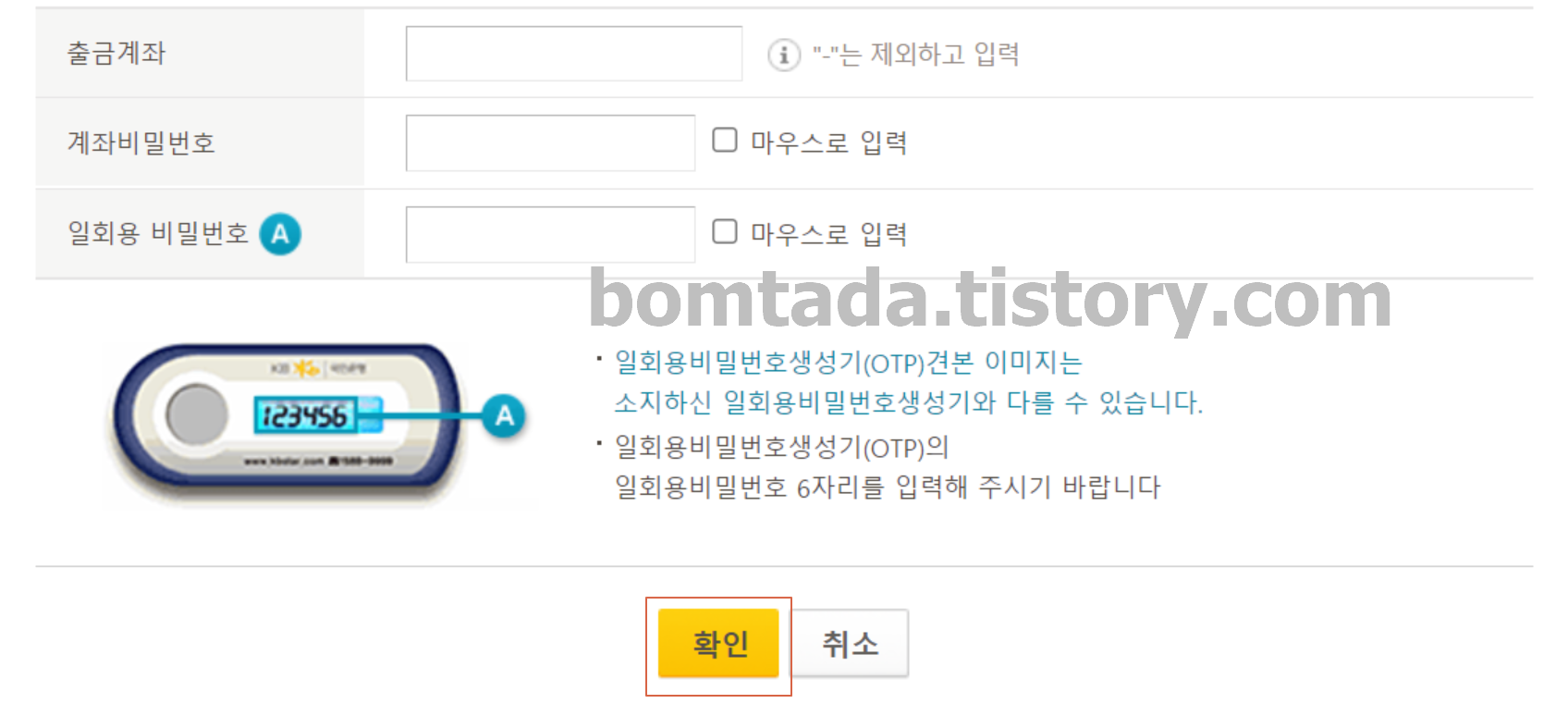8. 사업자통장의 출금계좌와 비번 및 OTP를 켜서 나오는 6가리 일회용 비번을 입력합니다. 저는 마우스로는 이상하게 계속 틀리게 나와서 일부러 체크를 끄고 키보드로 했습니다. 보완을 중시하면 마우스가 낫지만 이상하게 오류가 계속 발생해 다르게 진행했음을 밝힙니다.