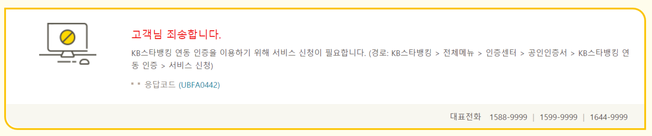 4. 아뿔싸! KB스타뱅킹 연동 인증을 이용하기 위해 서비스 신청이 필요하다고 나옵니다. 이렇게 오류 메세지가 나오면 그대로 따라 해보고 안되면 1번 과정을 다시 시도합니다.