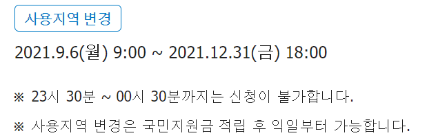 2021년 9월 6일 오전 9시 ~ 12월 31일 금요일 오후 6시까지는 사용지역을 변경할 수 있습니다. 국민카드 홈페이지에서 주소지와 다른 실거주지로 사용처를 변경가능하니 참고하세요.