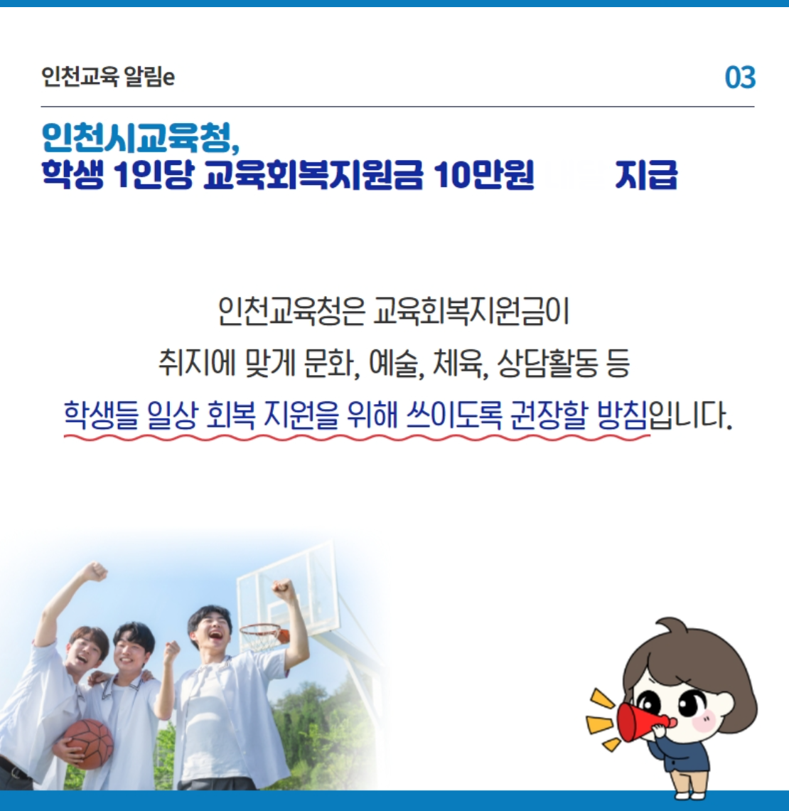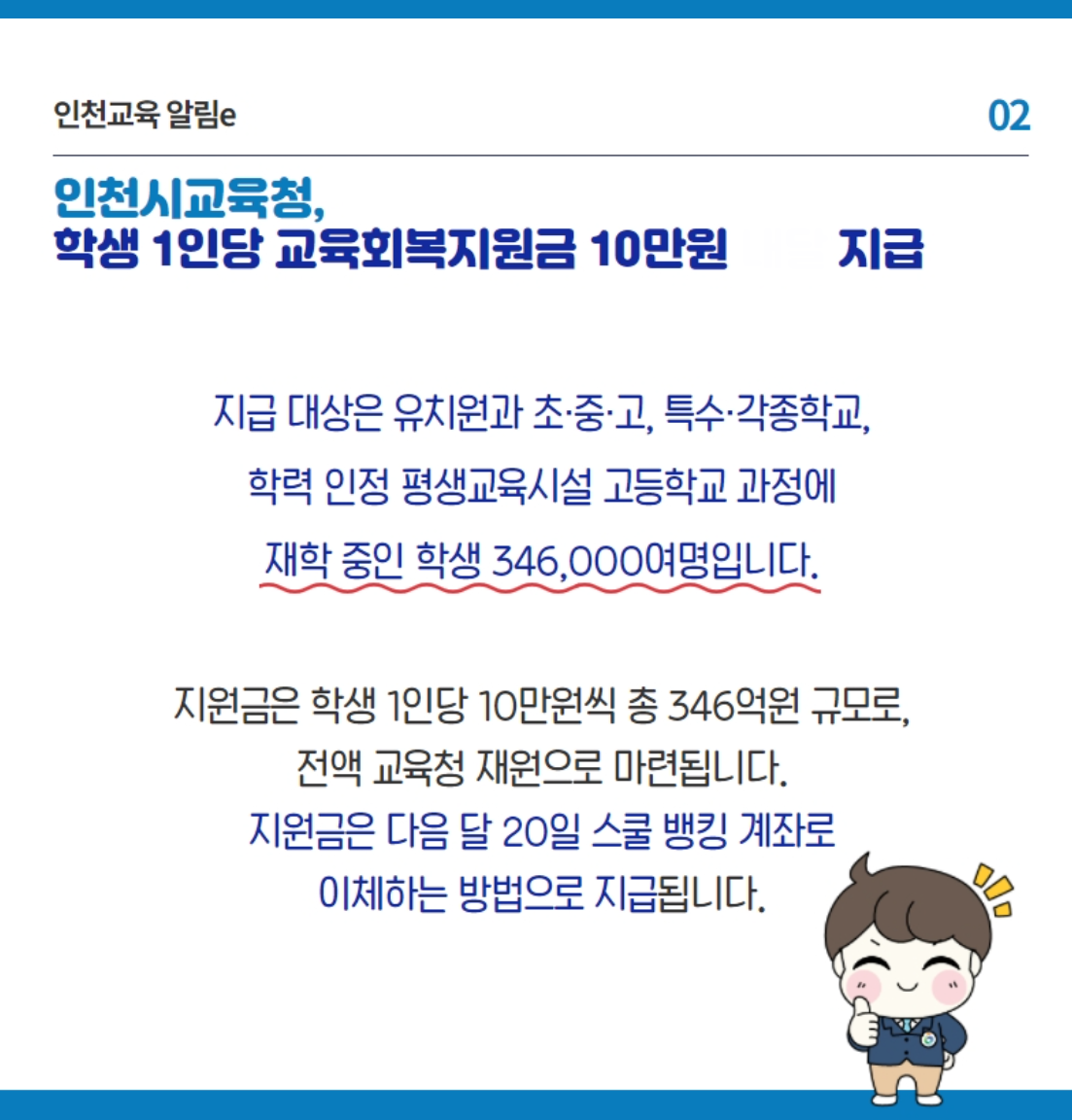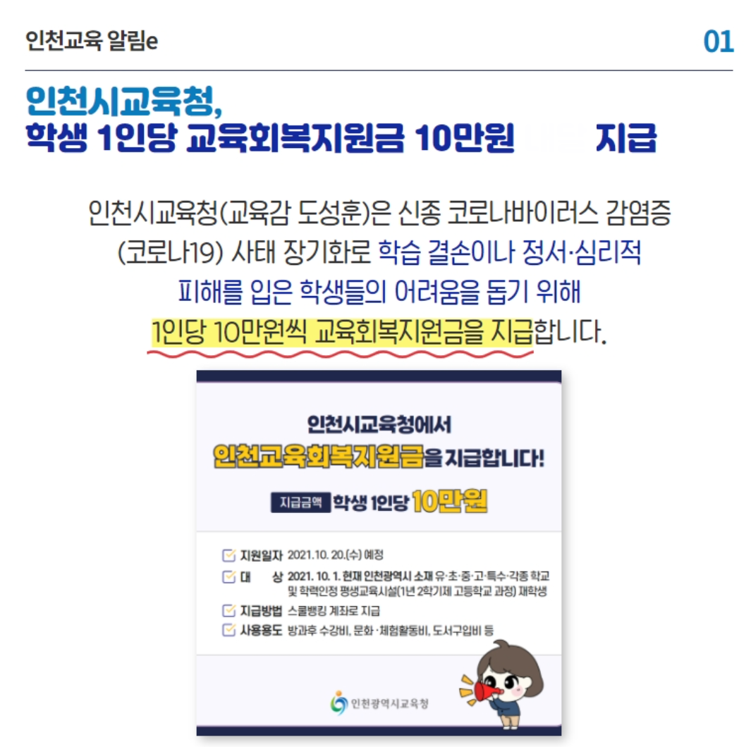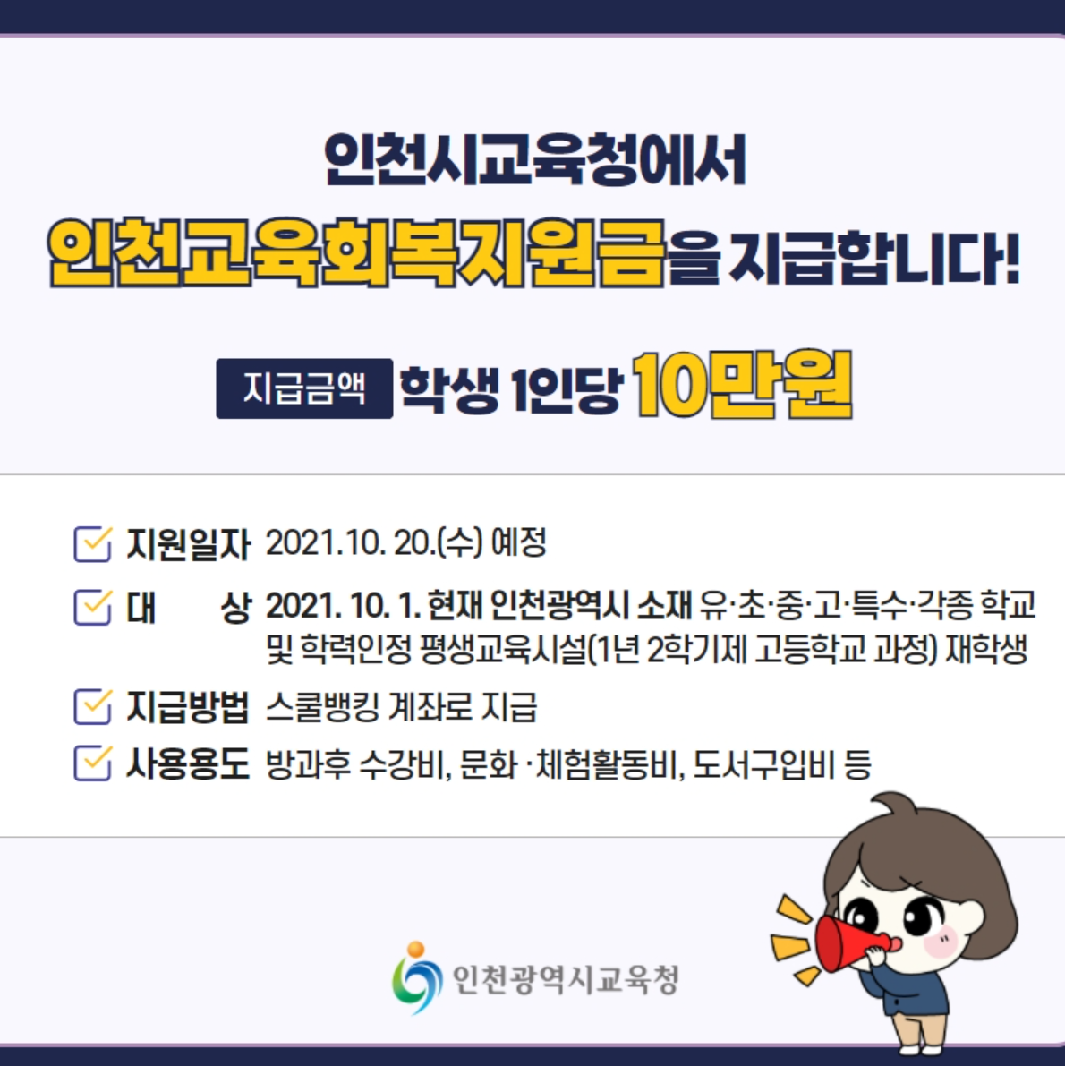 아이들의 학교 소식지를 통해 많은 학부모님들이 받아봤을 안내문이라 생각합니다. 인천광역시 교육청에서는 2021년 10월 20일 수요일날 학생 1인당 10만원을 지급합니다. 대상자는 21년 10월 1일 현재 인천시 소재의 유치원, 초중고등학교에 재학중인 학생입니다.