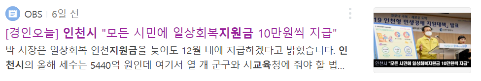인천시에서 일상회복지원금이란 이름으로 전 시민에게 10만원을 지급한다는 방침을 10월 6일 발표했습니다. 9월달은 국민지원금을 받고 10월과 11월은 소비지원금으로 캐시백 정책을 시행하는 와중에 인천광역시에서 자체적인 지원을 결정한 것입니다.