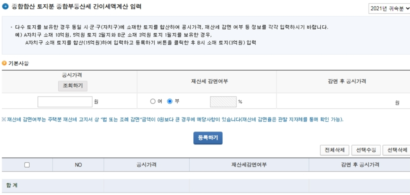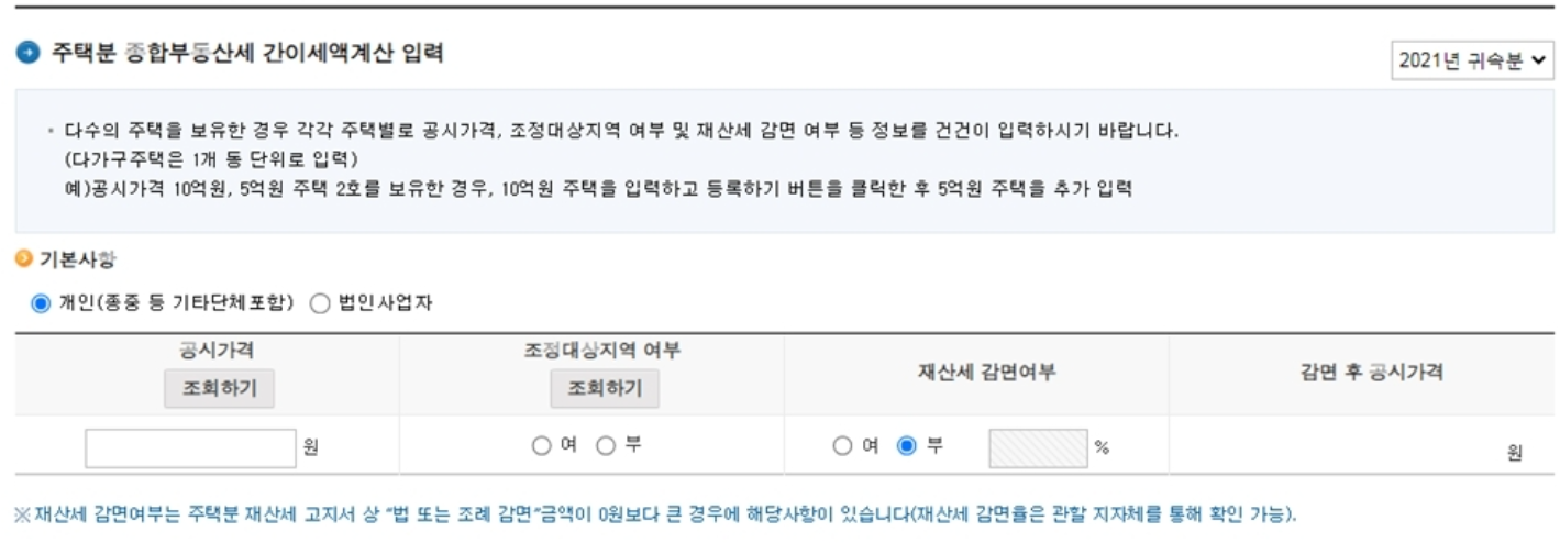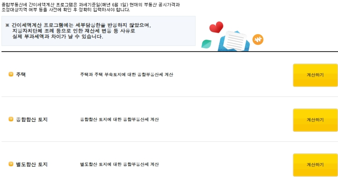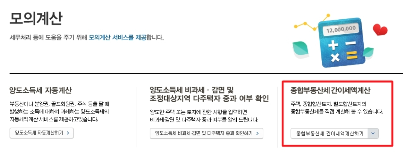 종부세를 좀더 쉽게 계산하려면 국세청에서 제공 중인 종부세 계산기를 활용하면 됩니다.