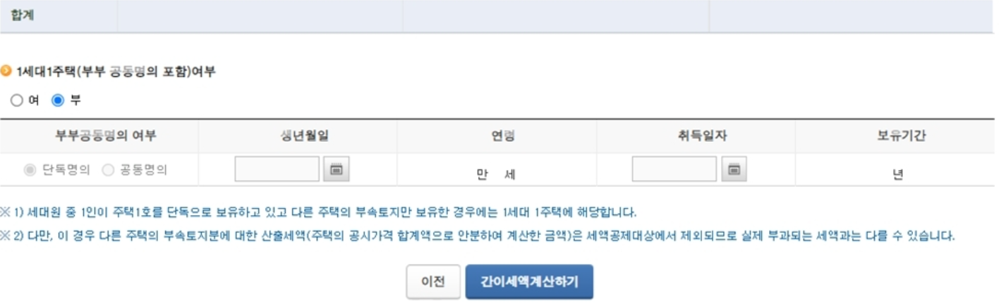 4. 본인이 가지고 있는 부동산 공시가격을 조회한 다음 조정대상지역 여부를 조회하고 단독명의, 공동명의를 선택합니다. 생년월일 및 취득일자를 고르고 간이세액 계싼기를 클릭해서 계산하면 종부세 계산을 끝이 납니다.