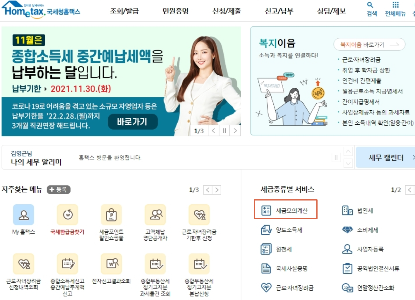 1. 국세청 홈택스로 접속한 분들은 본인인증 후 중앙에 있는 세금모의 계산 메뉴를 클릭합니다.