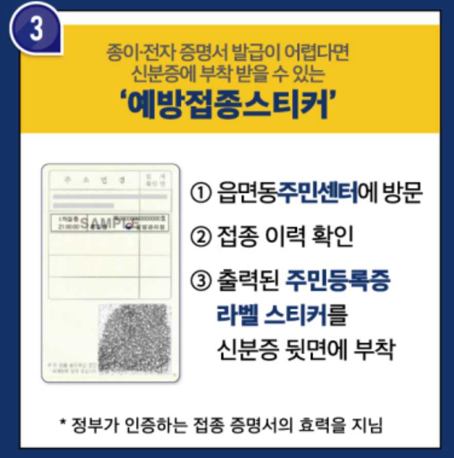 나이가 있거나 귀찮은게 싫고 복잡한건 딱 질색인 분들은 행정복지센터에서 접종이력을 확인 후 주민등록증 뒷면에 라벨 스티커를 부착해줍니다. 정부가 인정하는 접종 증명서 효력을 갖게될 뿐더러 지갑에도 편하게 넣어서 갖고 다닐 수 있어서 편합니다.