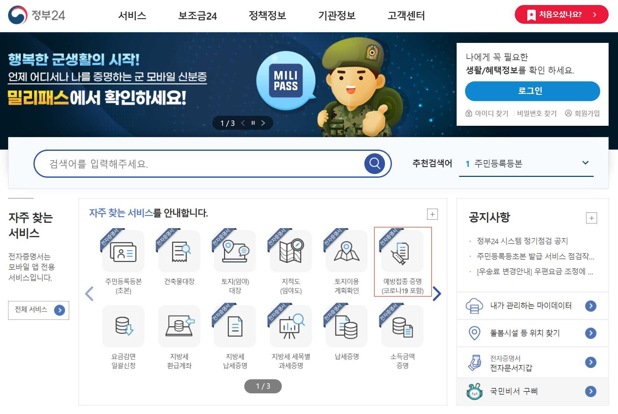 정부 24라는 곳으로 들어가면 자주 찾는 서비스란에 예방접종 증명이란 단어가 있습니다.