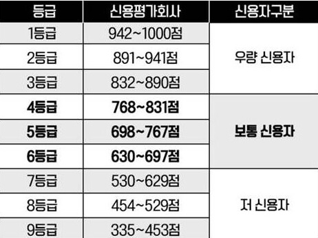 - 4등급 : 768 ~ 831점 보통 신용자로 구분